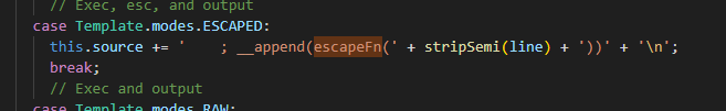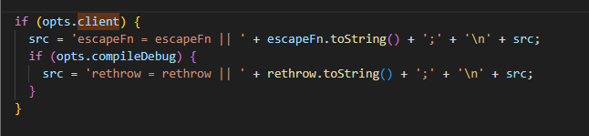 escapeFunction의 역할은 ejs에서 escape되는 문자열을 랜더링 할때 ex : <%= "string" %> string이 escape되기 위해 실행 되는 함수이다. 따라서 우리가 escapeFunction을 덮어준다면, <%= "ex" %> 로 렌더링 되는 모든 문자열을 덮을수 있다는 의미이고, 이는 곧 infoLeak이 아주 쉽게 가능해짐을 알 수 있다.